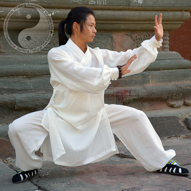 Authentic soft and breathable Daoist uniform in white color. Natural linen/cotton fabric without chemical colorings. With frog button cuffs and elastic closed legs.